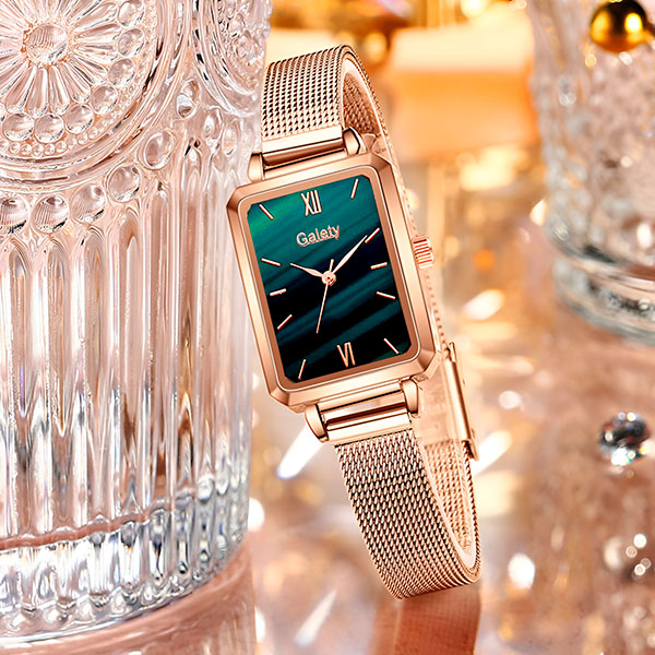 Ten zegarek ma błyszczący kolor różowego złota i piękną zieloną tarczę. Dodaje stylu każdej sukience, dżinsom czy eleganckiemu strojowi.
