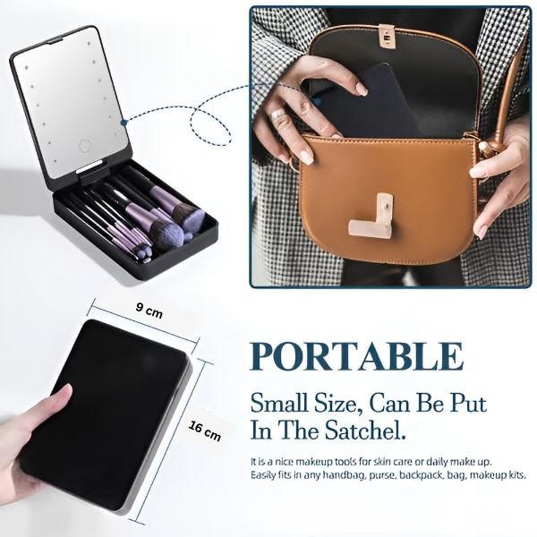 Zestaw pędzli i lusterko LED idealnie mieszczą się w torebce, dzięki czemu możesz z łatwością poprawić makijaż w dowolnym miejscu.